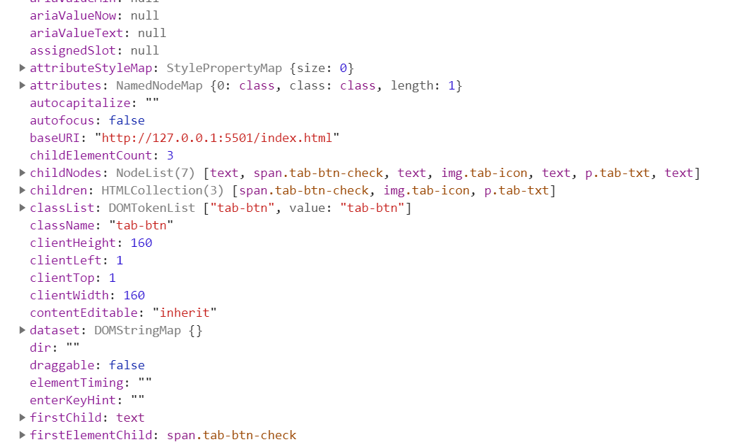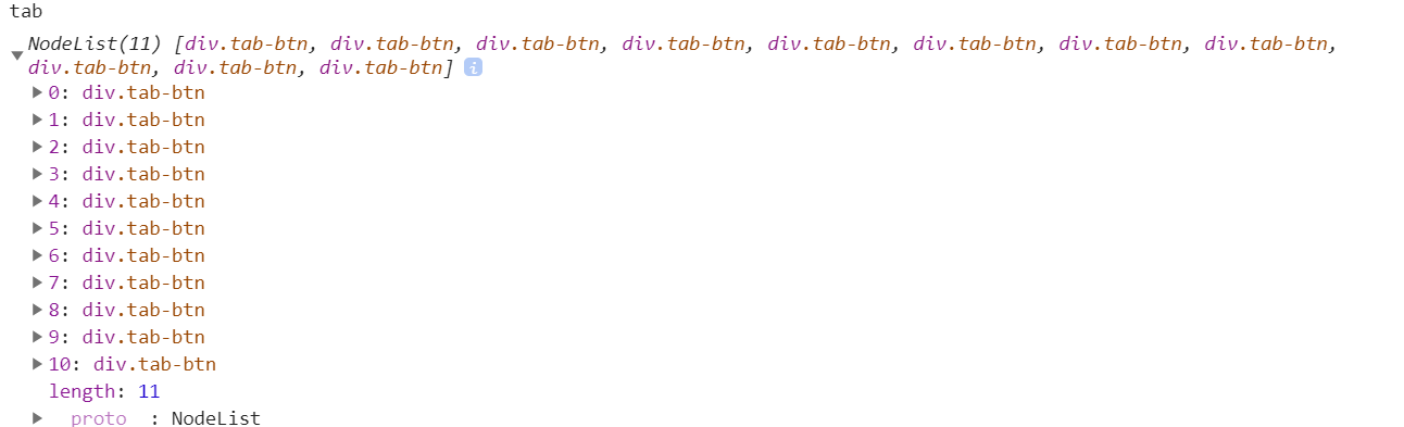 거기에서 배열 느낌으로 제가 불러온 div 태그의 class Name이 tab-btn들이 잘 들어와 있군요