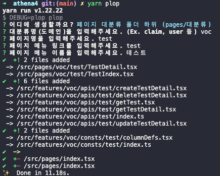 yarn plop 명령어를 실행하면 이렇게 사용자 입력을 받고 조건에 맞게 파일을 생성해줍니다