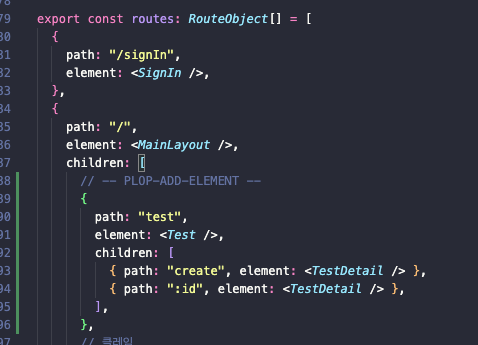 그 다음 2, 3번째 modify은 pages index.tsx 파일에 import하고 추가하는 형식인데, 원래 custom action 방식으로 정규식 표현을 이용해 element <MainLayout />을 찾으면 그 아래 children index 가장 마지막에 추가하려고 했었습니다만... 계속 children 하위 메뉴 index 0번째 object의 children에 추가되는 상황이 발생하였습니다.......
